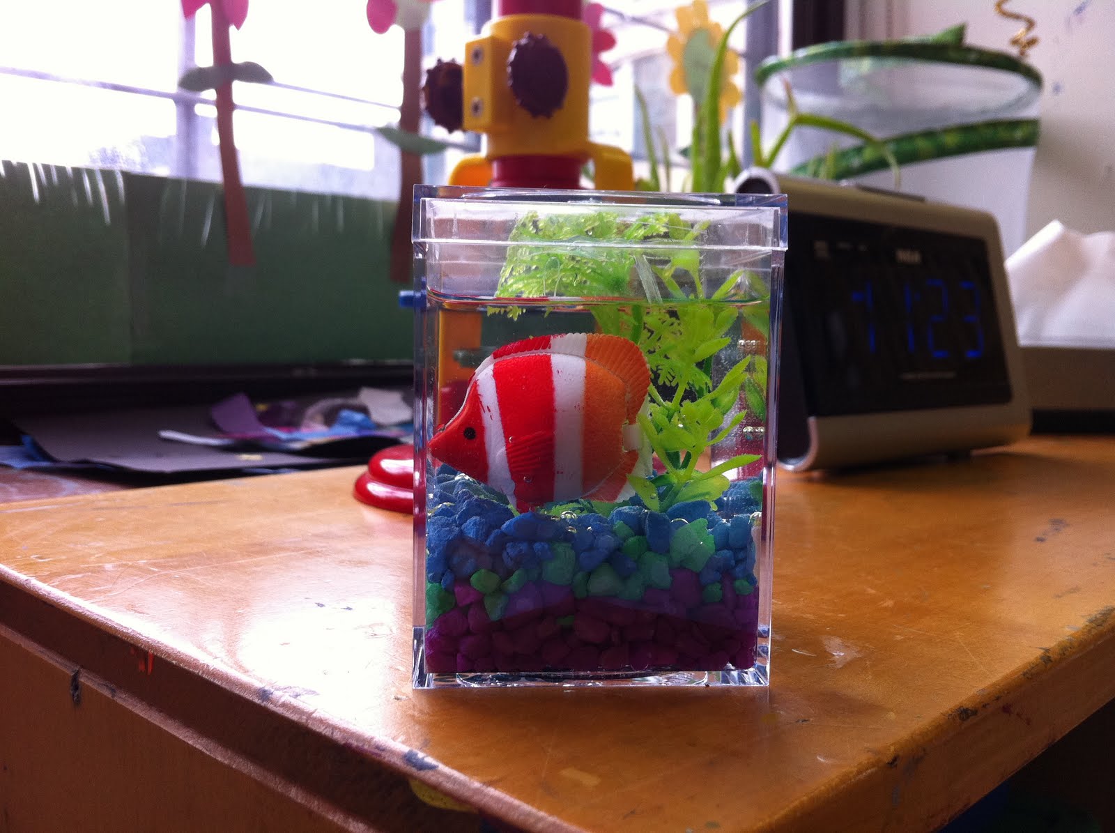 We made these mini aquariums with our kids’ pre-K class. So easy with boxes from the Container Store, gravel, toy fish and a plant. The kids loved them!
