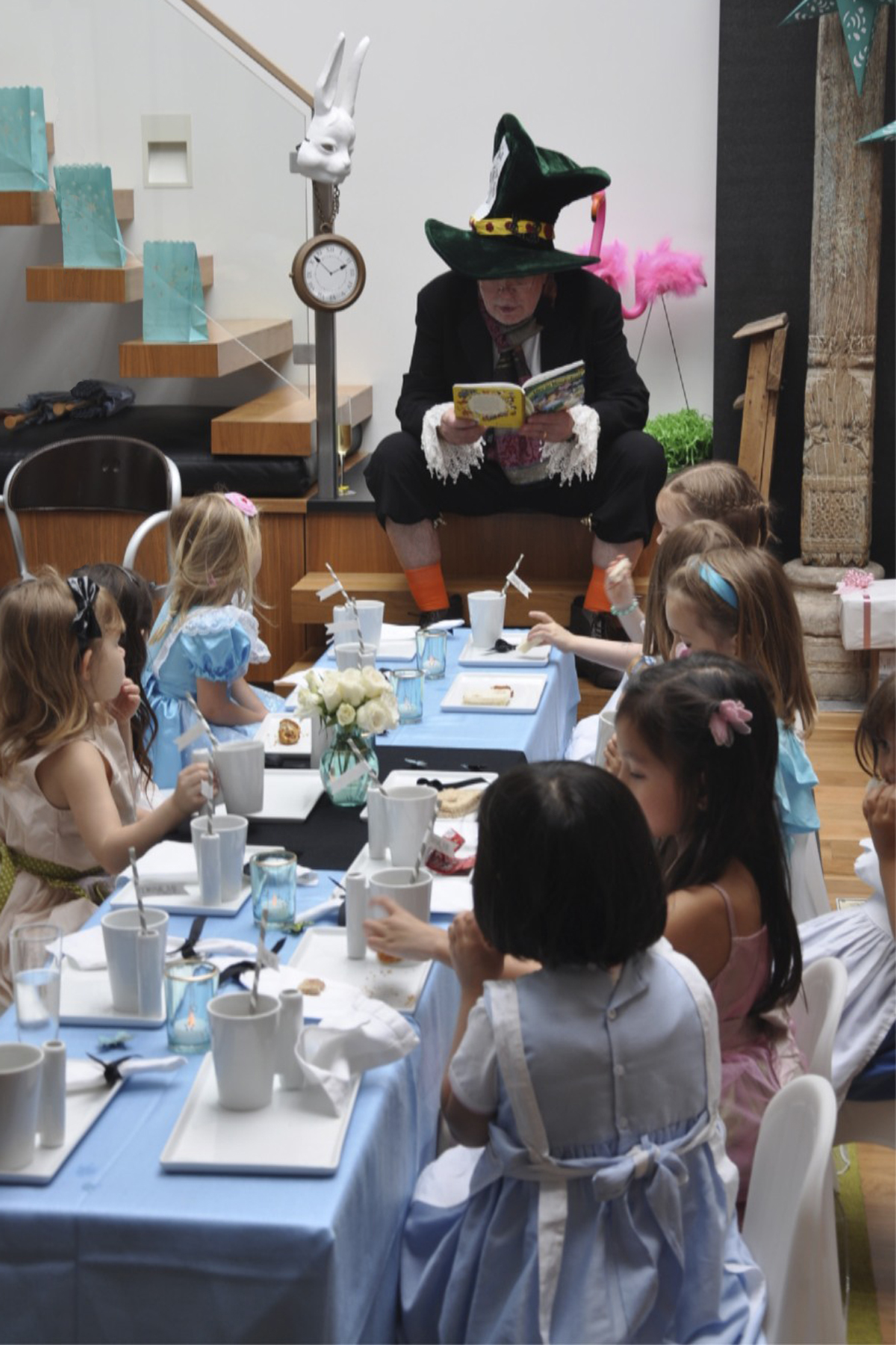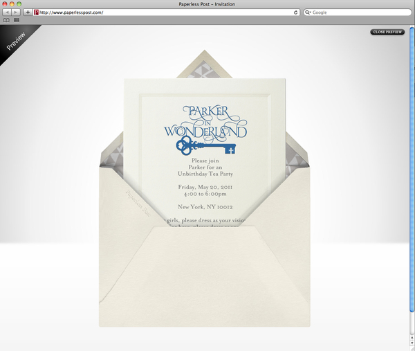 We decided to send invitations via Paperless Post. We love that you can upload your own logo and personalize your stationery. We asked all the guests to come dressed as their versions of Alice for girls and the Mad Hatter for boys.