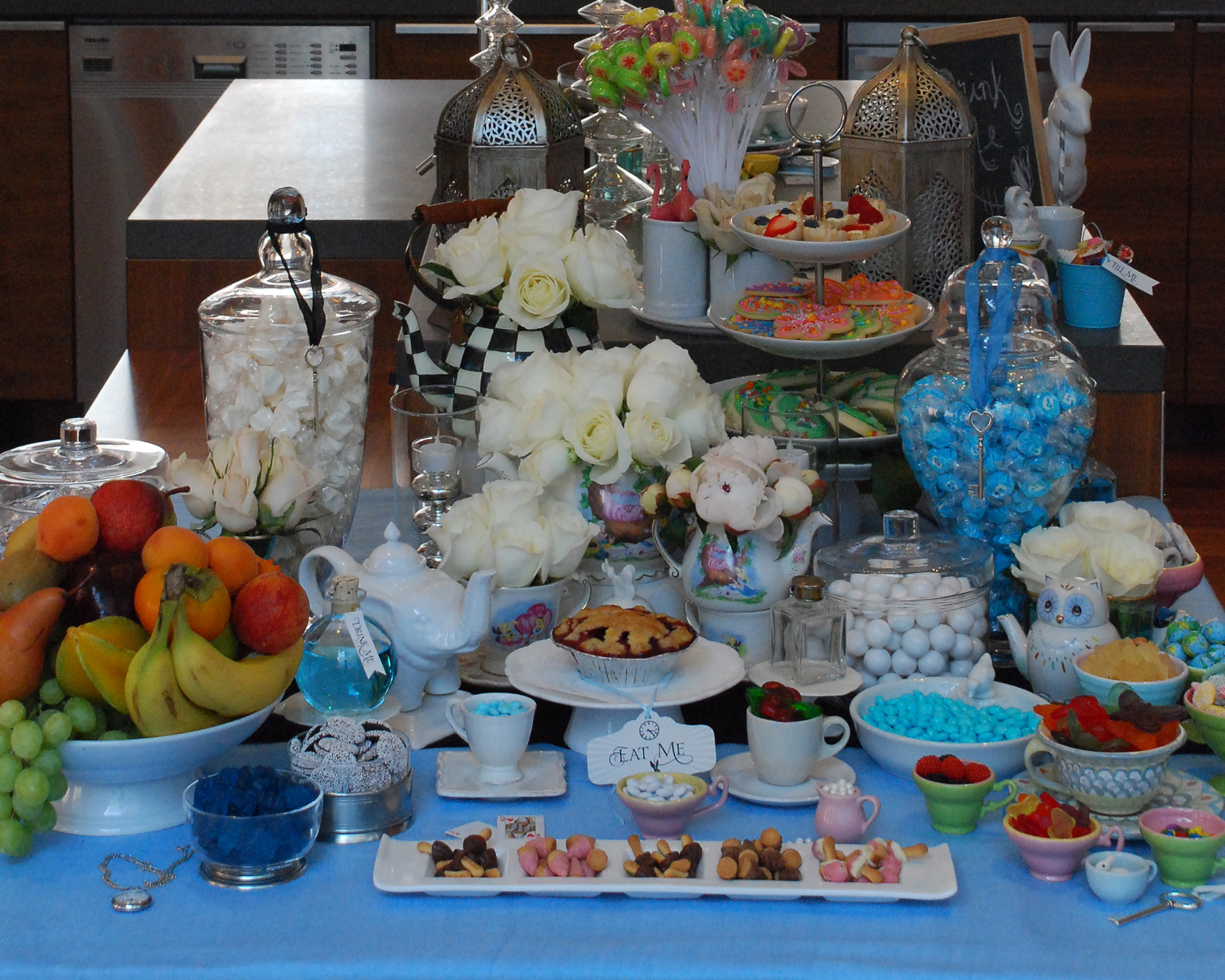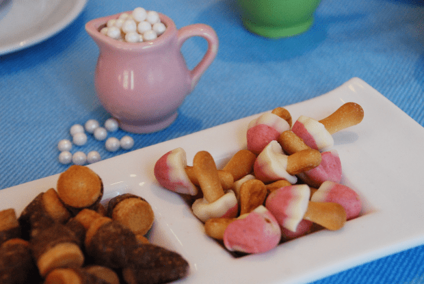 We tried to stick with a blue and white theme to compliment Alice’s dress, so white gumballs, blue M&Ms, vanilla taffy and yogurt pretzels helped fill the table. We also had little chocolate and strawberry candy mushrooms as Alice ate them in the story.