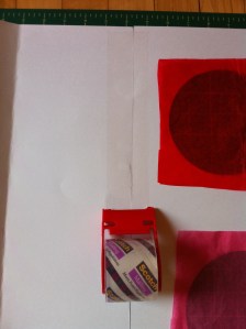 We recommend cutting individual squares since punching out one hole may pull the paper off the others. Once you have all the circles covered, tape them together to form one long strip. You should then have something that looks like this.