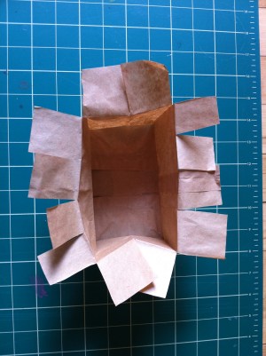 Next, take your lunch bags and cut off the top 6 inches. (We saved the tops and made small snack bags by gluing and folding the bottoms shut.) Take the bottom half of the bag and start making 1 inch cuts along the top and then fold them over. These tabs will be what you use to tape them down. Repeat with all the bags.