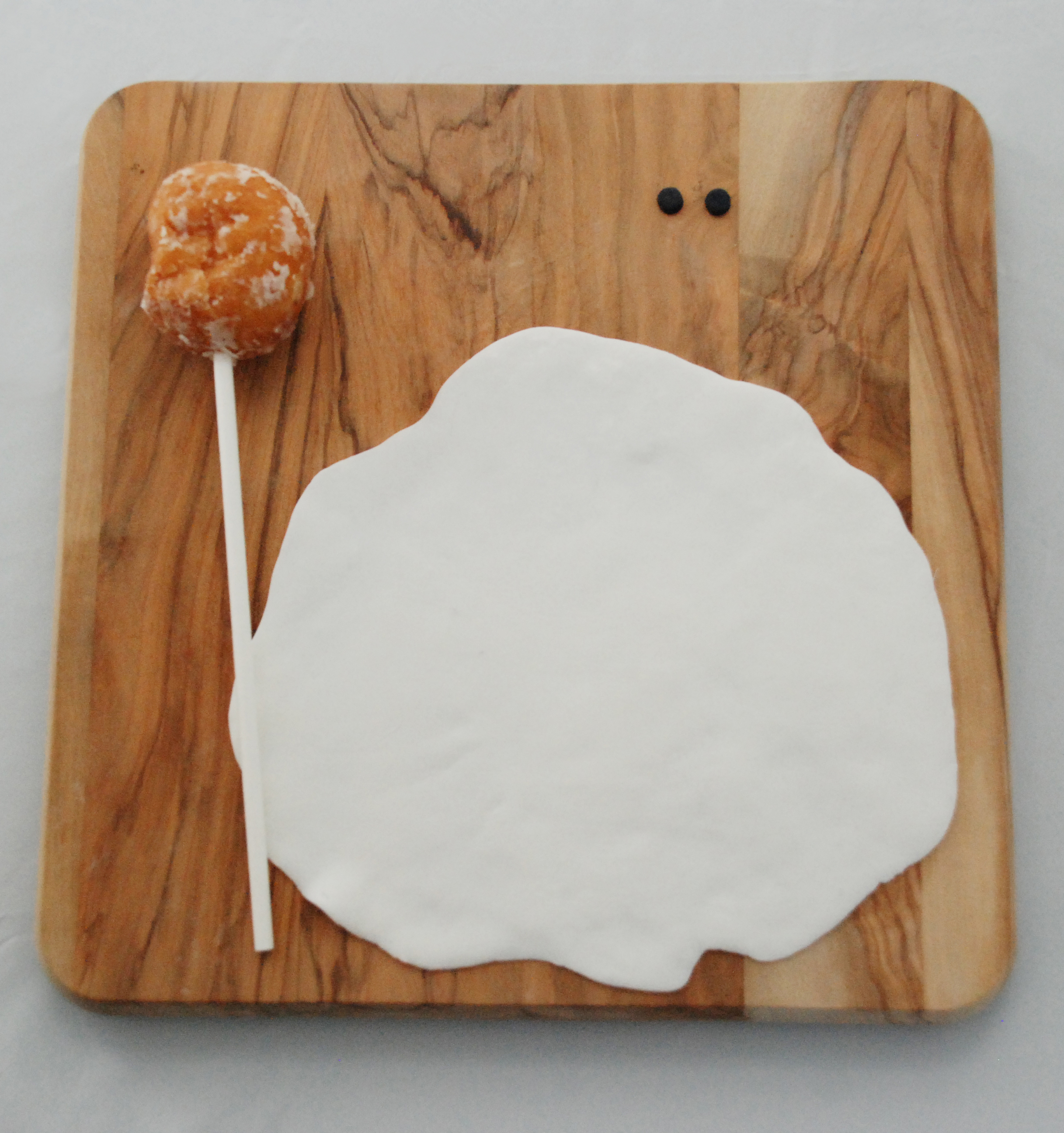 Take a walnut-sized ball of fondant and roll it out. No need to worry about making the edges perfect for this. Cover a donut hole with the fondant and place on a stick.