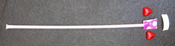 First, take the label off the Pixie Stix. Then, using glue dots, attach a chocolate heart to each side. Make sure the hearts line up.