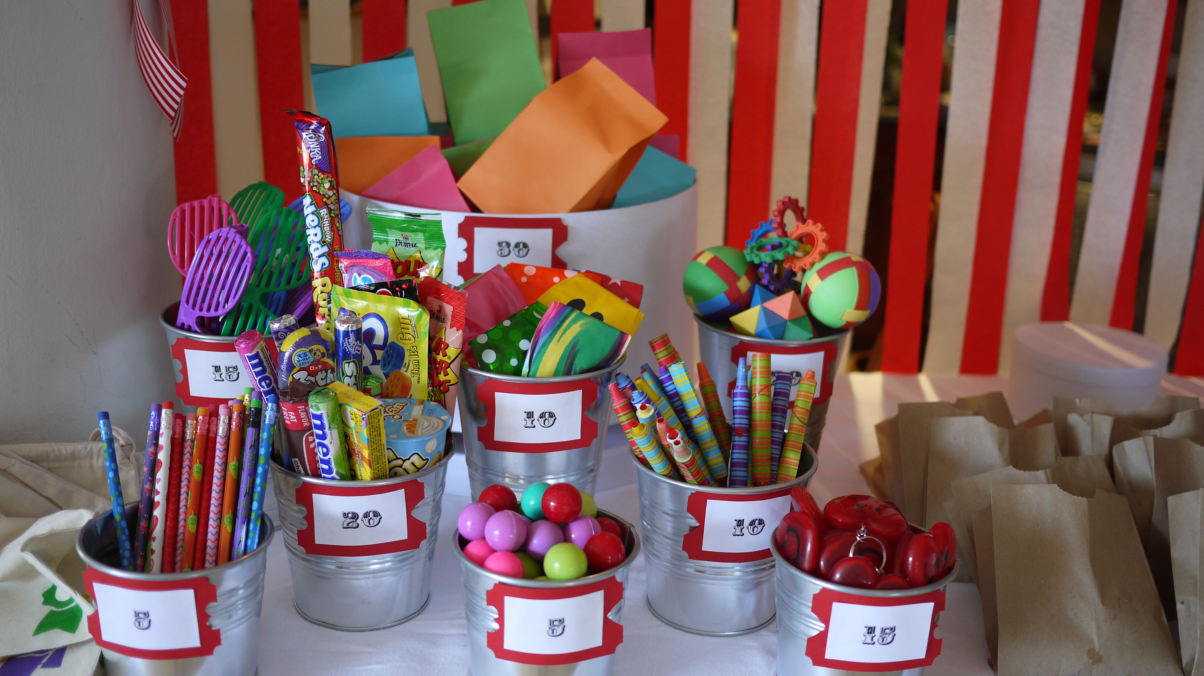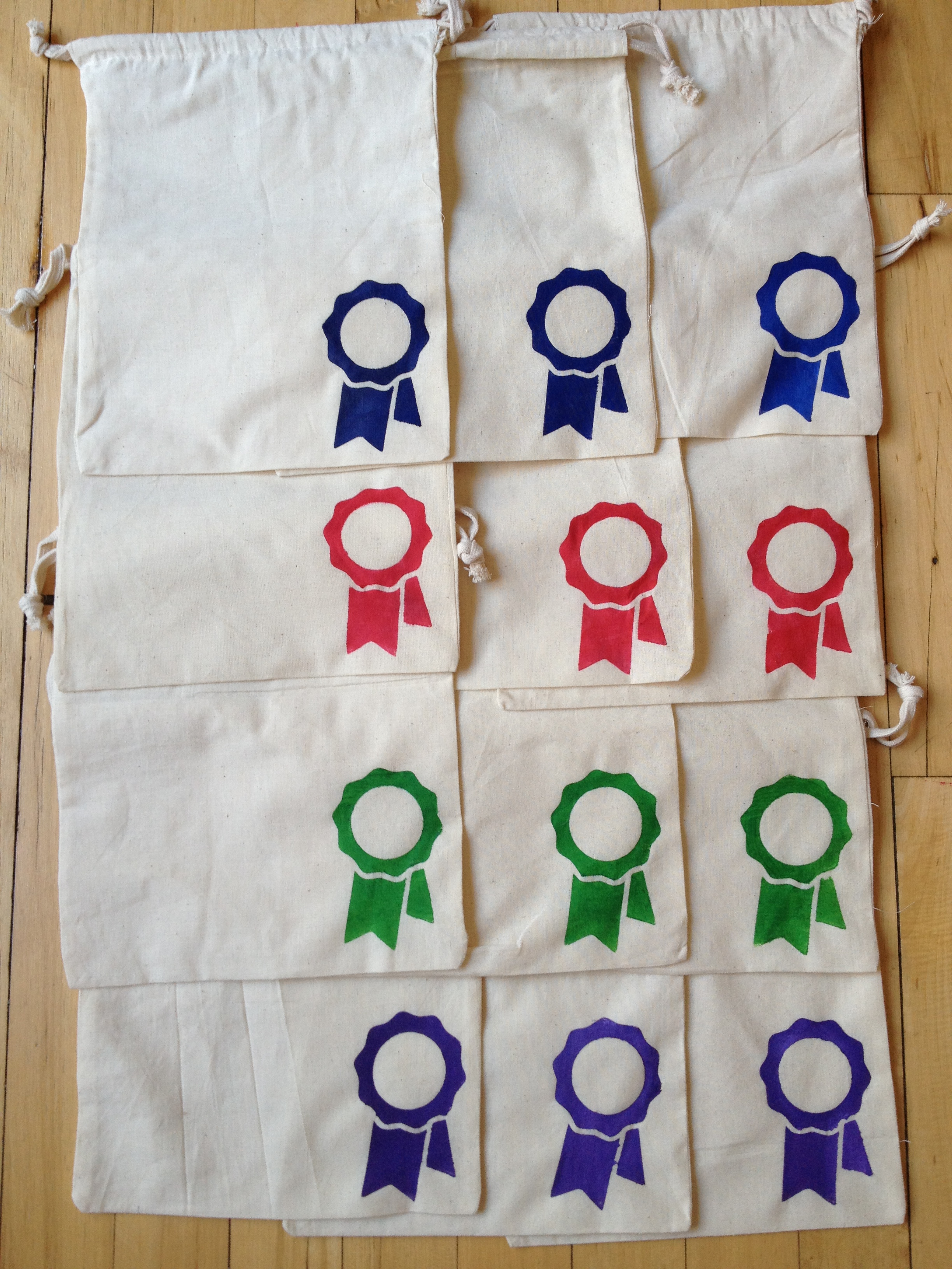 We gave each child a drawstring bag stenciled with a ribbon to hold tickets.
