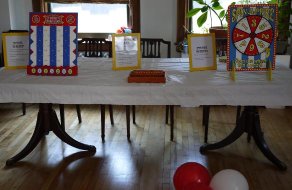 Of course, we needed some games so the kids could win tickets. I ordered the Spin-A-Prize wheel and the Disk Drop from Oriental Trading. They were actually pretty solid pieces. I also used a Shut the Box game I had gotten on sale at Amazon. The rules of each game were posted in colored frames from IKEA.