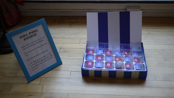 Ping Pong Bounce and the Ring Toss rounded out the games. I made a Ping Pong Bounce game out of a white shirt box, an insert from an advent calendar that I saved for some random reason, round stickers and card stock.