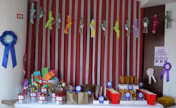 Melanie designed the invitation to look like a county fair flyer. I continued the award ribbon theme by making my own ribbons as well as cutting out ones from card stock to use as food labels. The labels for the prizes looked like tickets.
