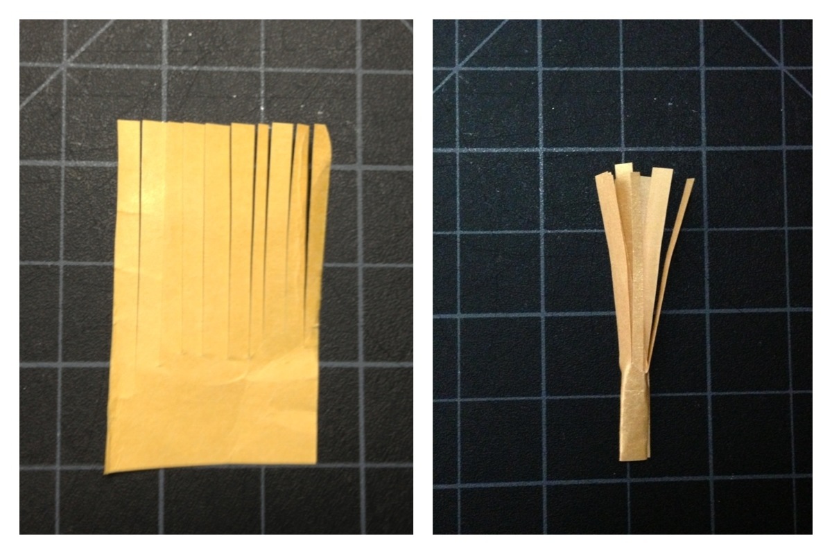 Take a small rectangle of your yellow paper and cut some fringe. Then roll the paper and glue to make the fuse.