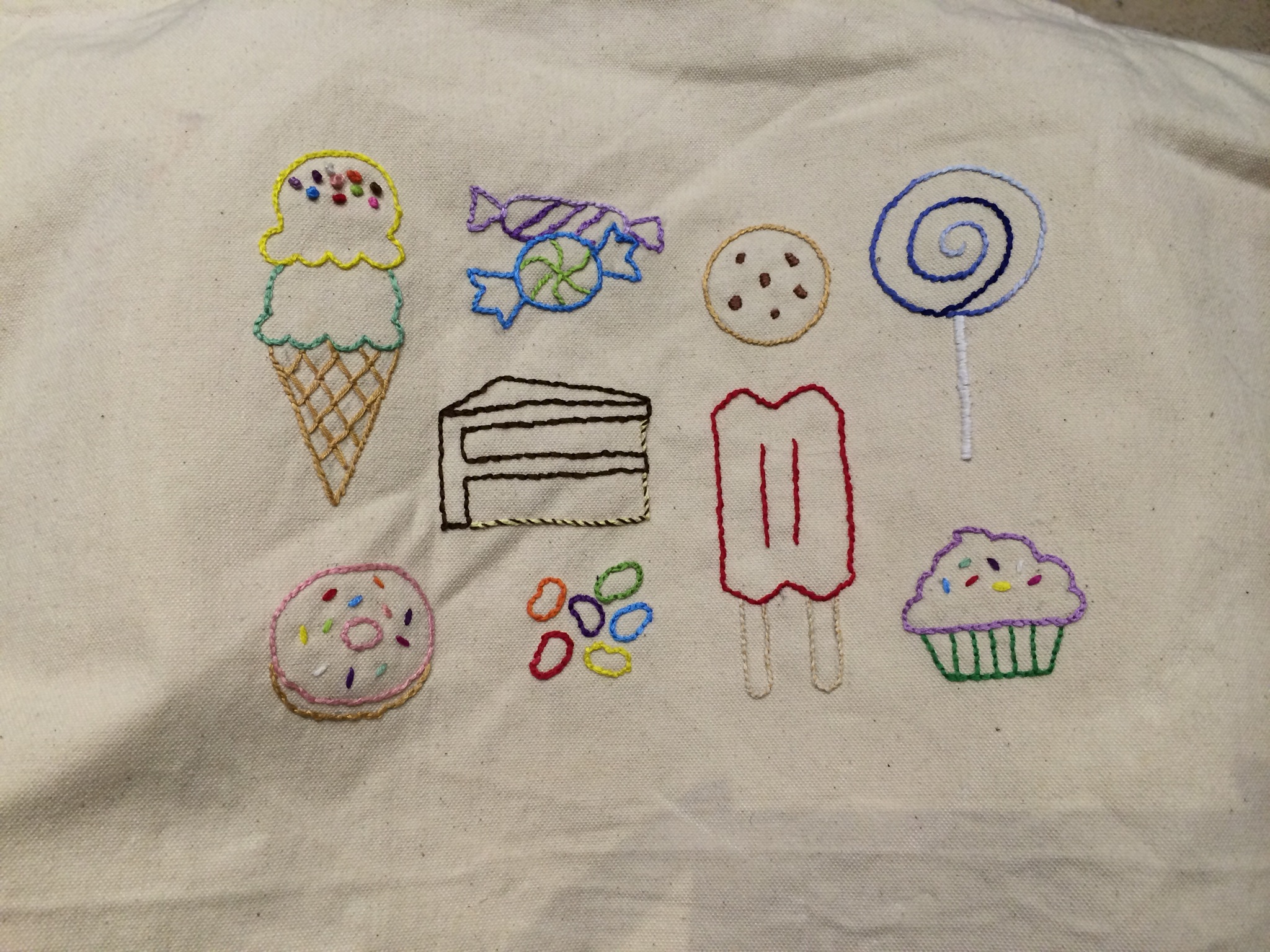I’ve mentioned InGreetings.com before as a great source for plain totes. I decided to use the techniques I learned from Sublime Stitching to embroider a zippered tote with all different kinds of sweets.
