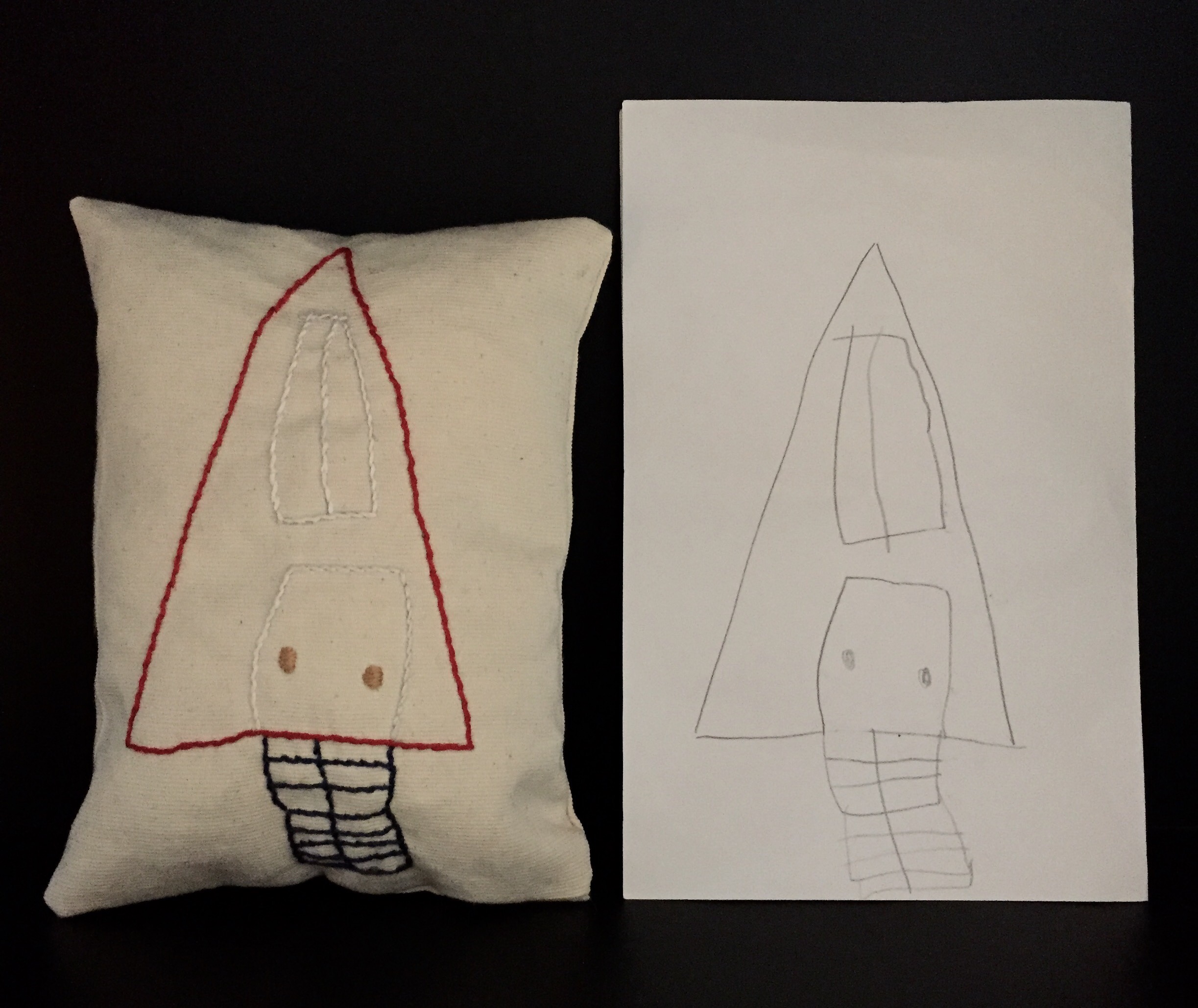 I took her drawing and used my Crayola lightpad to trace the image. Then I just used some basic stitches to embroider it with the colors she requested.