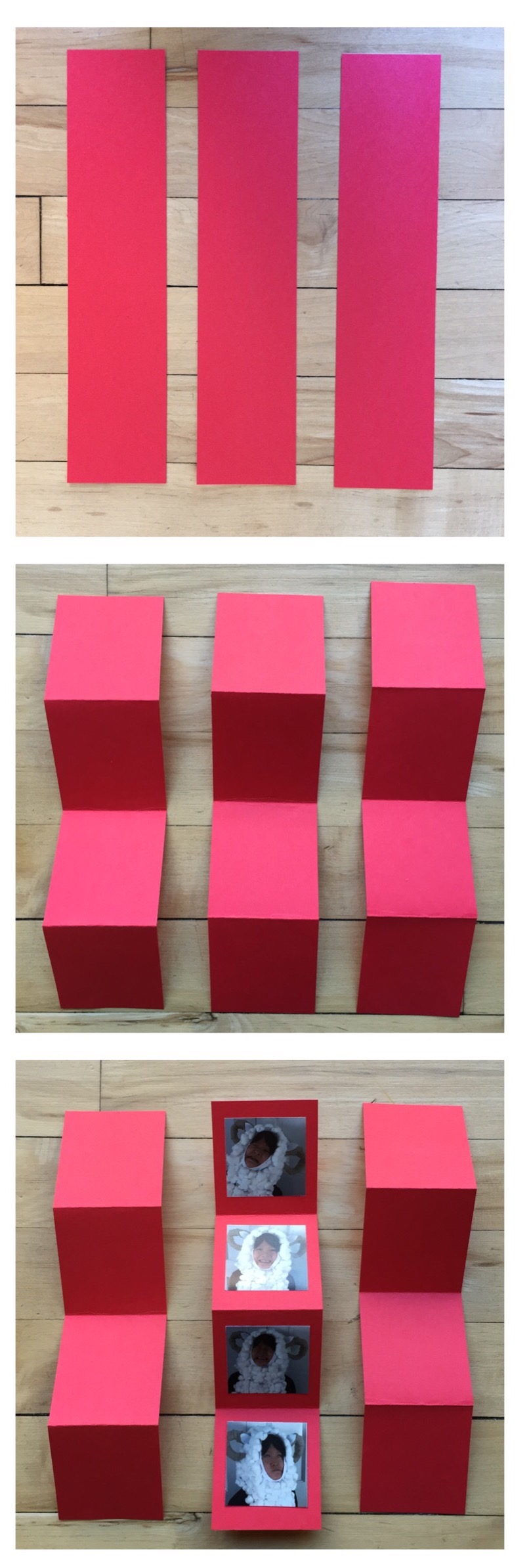 Walgreens will print out 4×4 photos, so I used a photo app on my phone to make a four-panel photo that I had printed. I then cut them into 2×2 photos and glued them to the panels.