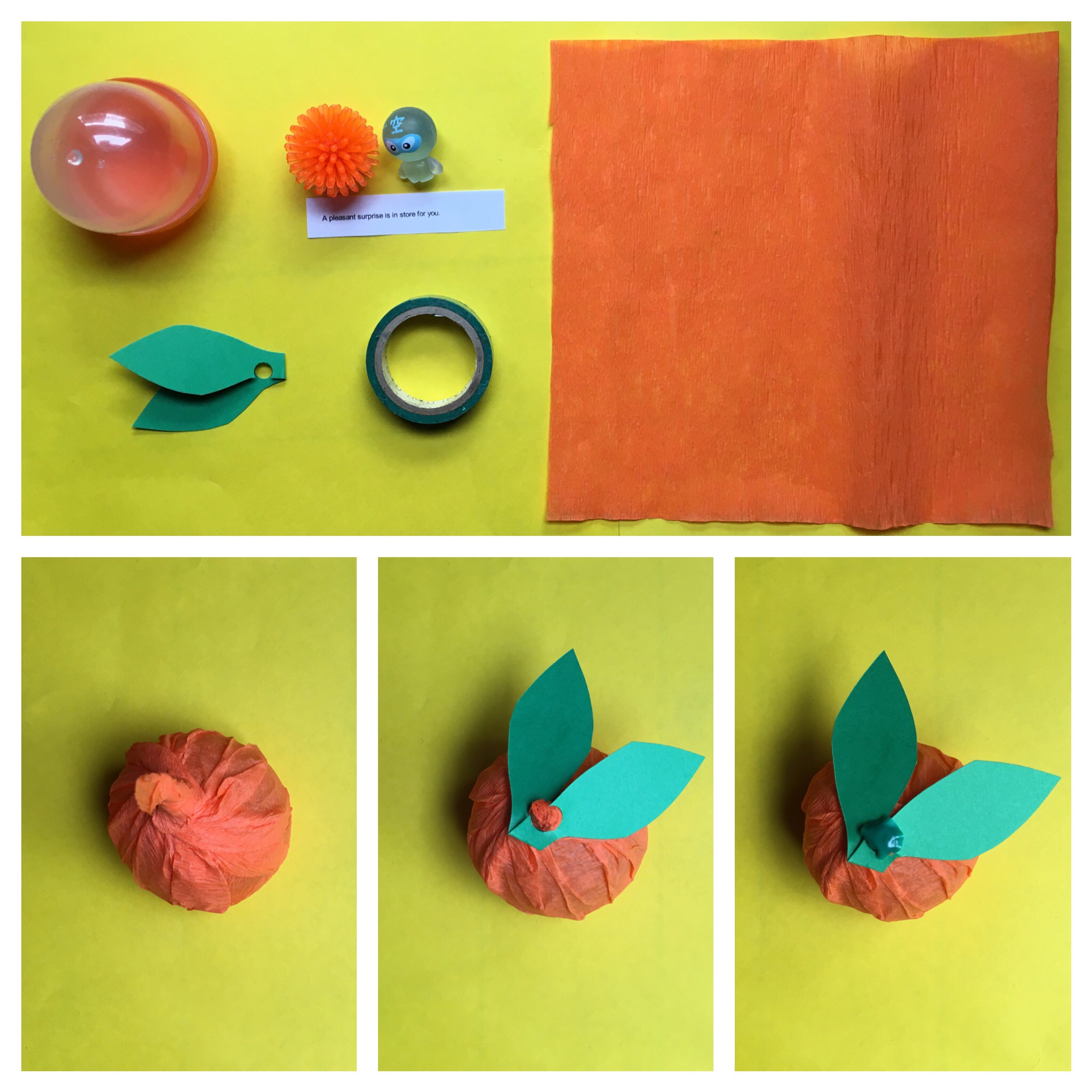 Oranges symbolize good luck for the Lunar New Year. I made these tissue paper ones for my son’s class. I used containers to hold the party favors but you can skip it and just use a bit more tissue paper to give your oranges shape.
