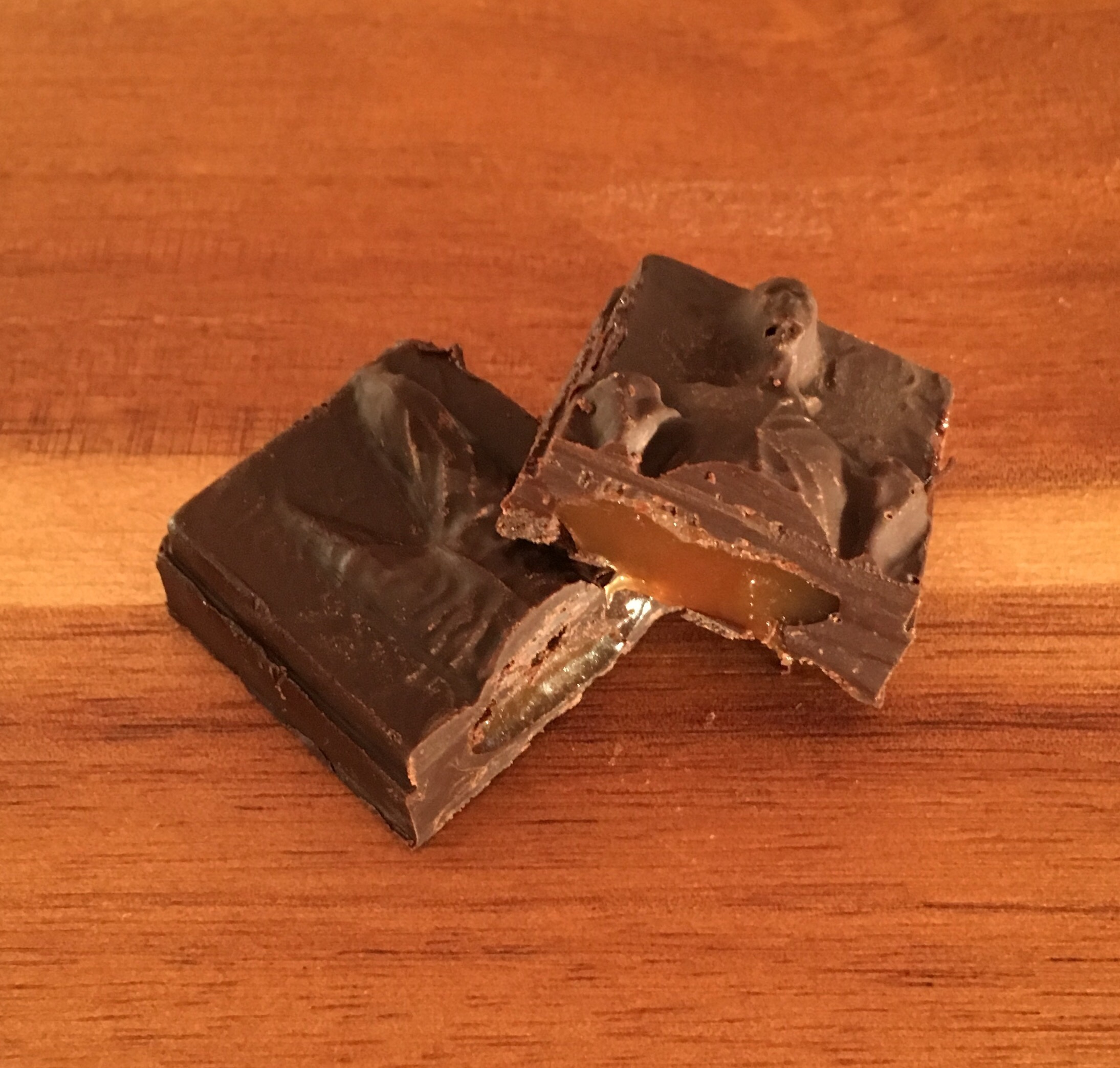I filled the mold maybe half way, tapped out the air bubbles and let the chocolate set a bit before placing the caramels in the molds. Then I covered them in chocolate and tapped out and remaining bubbles and waited. They turned out better than expected. Click here for chocolate melting tips.
