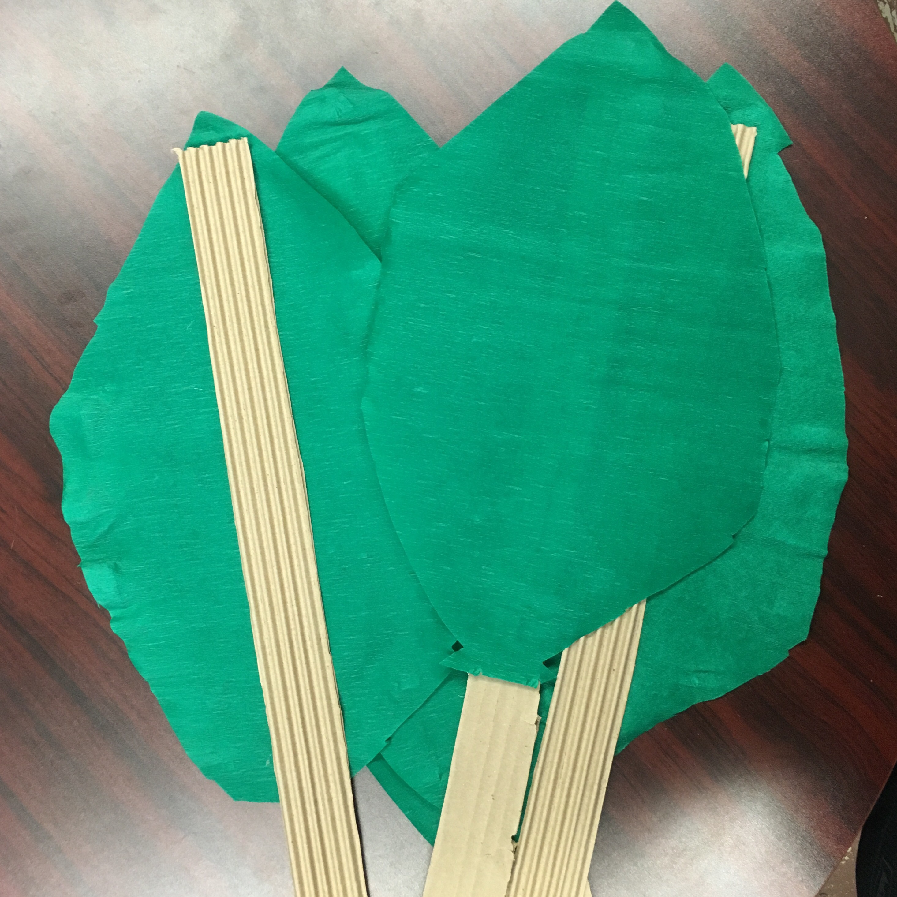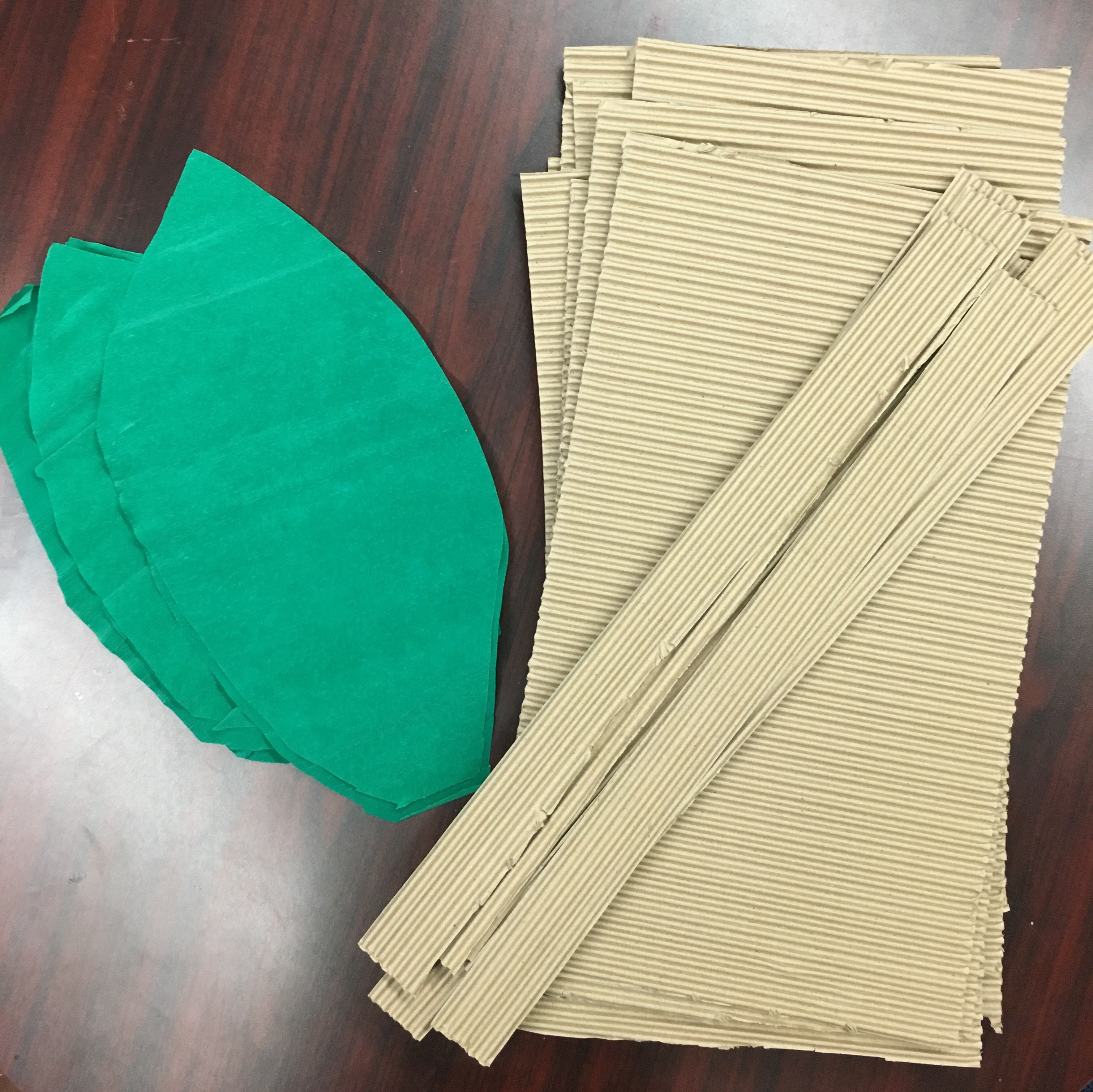 I cut leaves from crepe paper I had left over from last year’s auction. You can use tissue or construction paper. The crepe paper lets you stretch it a little and it gives a nice edge. I also cut strips of cardboard to be the spines of the leaves and rectangles of cardboard for the trunk.