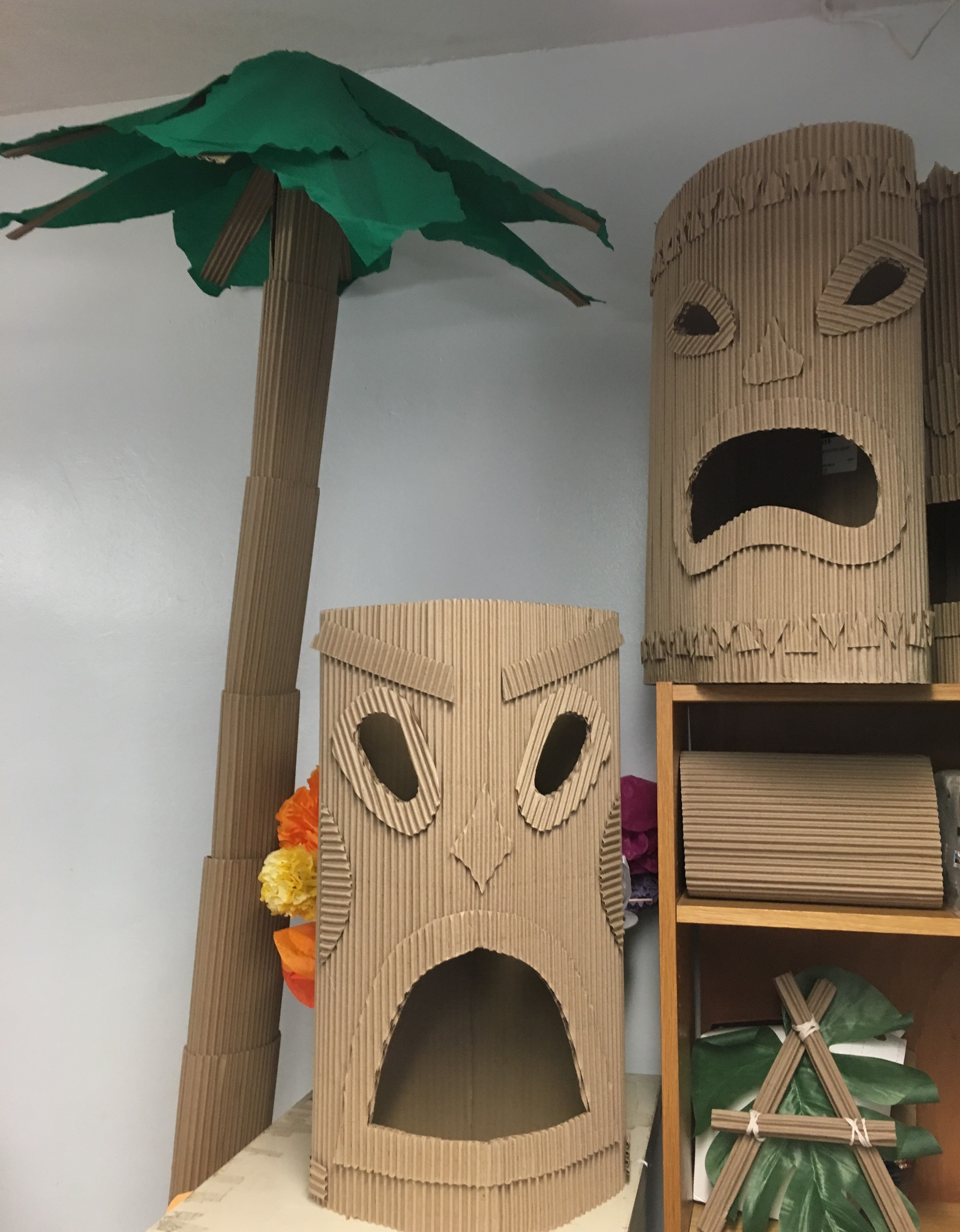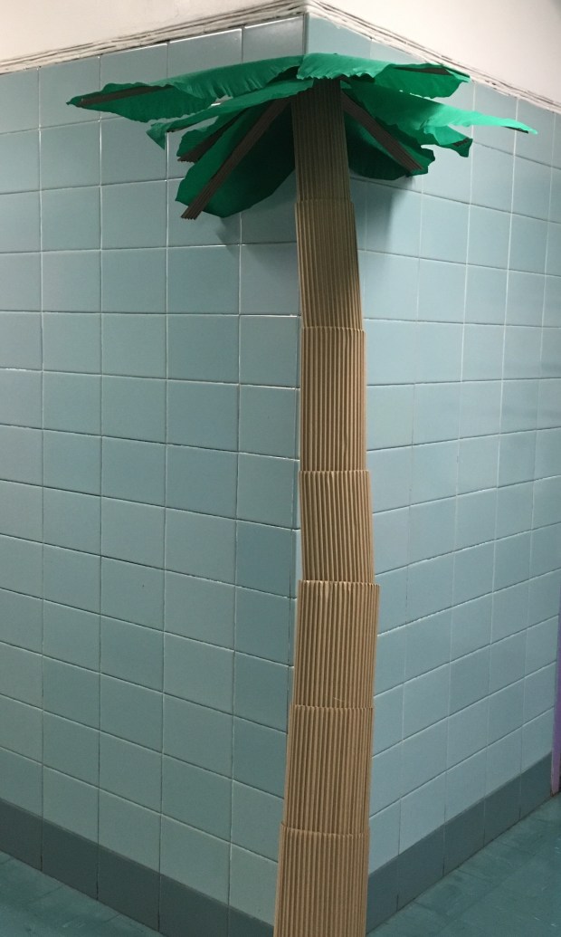 Our school is having a luau-themed auction this year. I bought a roll of cardboard from Uline to make tiki statutes but since I had so much leftover, I decided to try making a palm tree.