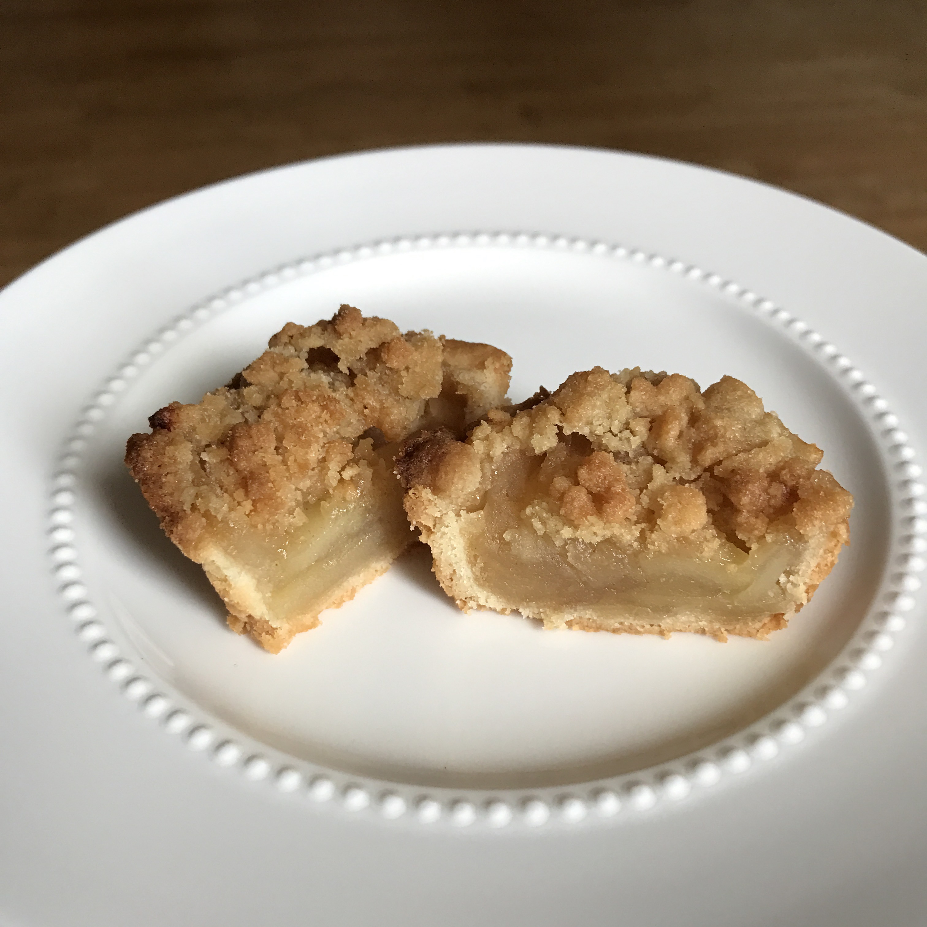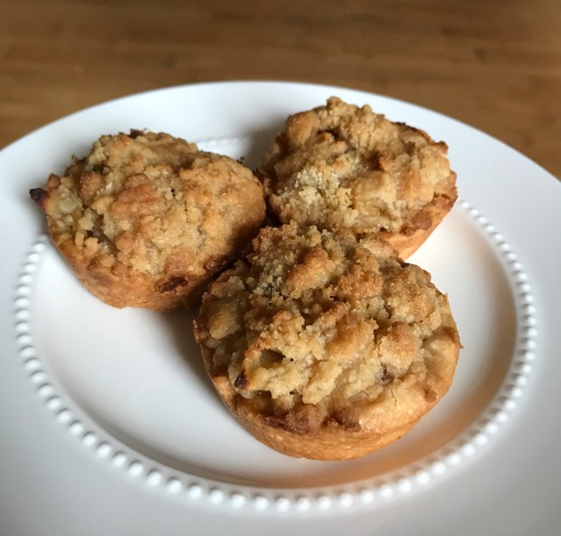 I couldn’t decide between making an apple pie or an apple crumble, so I combined them into a mini pie. I cut out circles of pie dough and placed them into buttered muffin tins, spooned in some filling and topped with crumble.