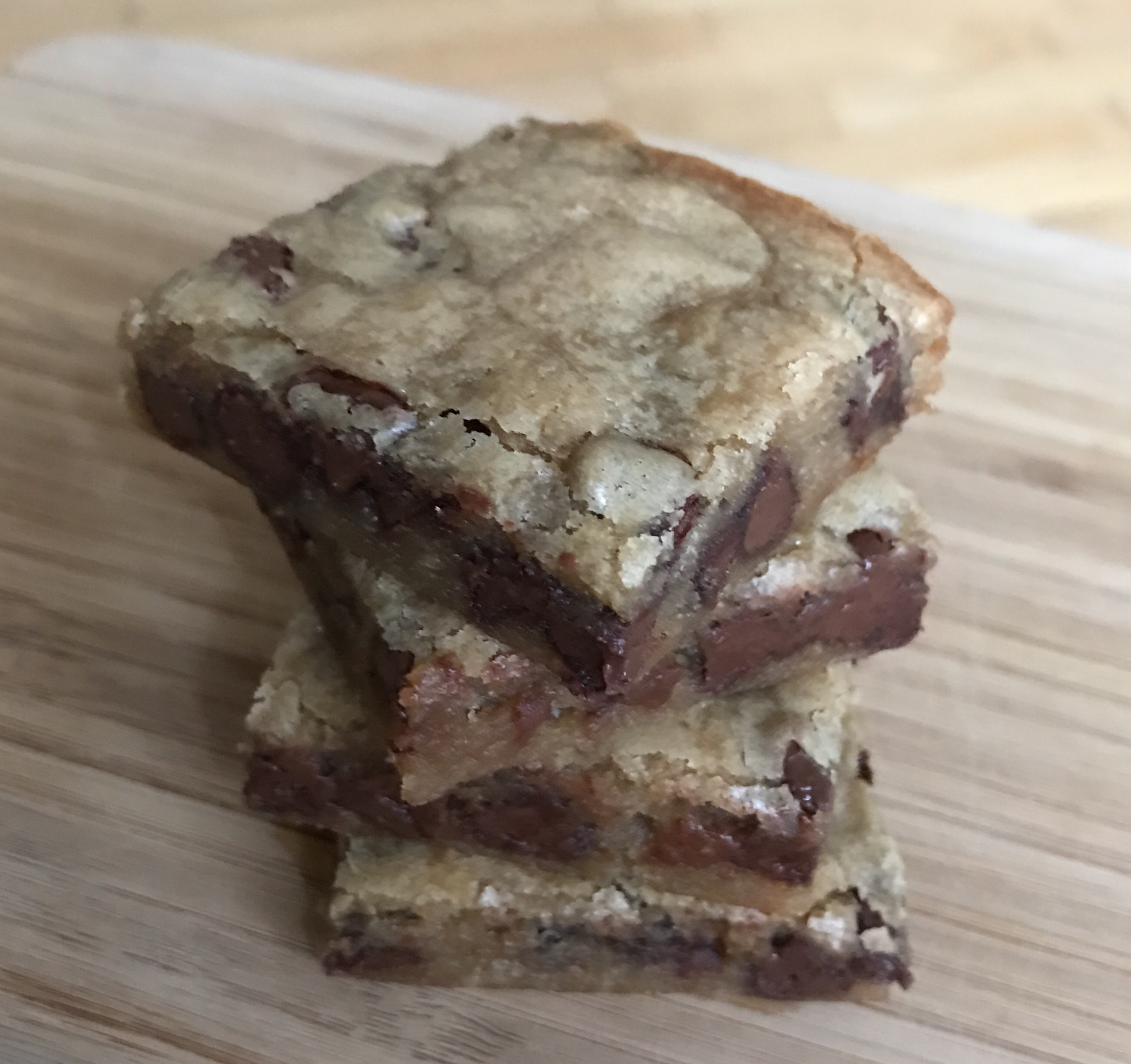 I couldn’t make brownies because I ran out of cocoa powder and I didn’t want to deal with cookies, so I decided on blondies with chocolate chips. I don’t know why I never made them before. So easy and so tasty!