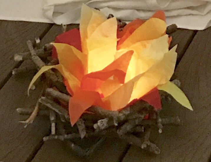 Next, take a square piece of tissue paper and cut the edges to look like flames. Later the colors and then place your string of lights in the center. Lightly bunch the paper around the lights and place in the center of the twigs. And that’s it!