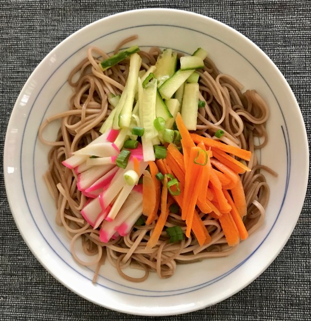 Cooking in the heat is no fun. This dish keeps the actual cooking to a minimum. All you need to do is boil the soba noodles. The rest is just cutting up your favorite toppings. This time I added carrots, cucumbers, scallions and kamaboko (fish cake). I used bottled mentsuyu for the dipping sauce but you can easily make your own.