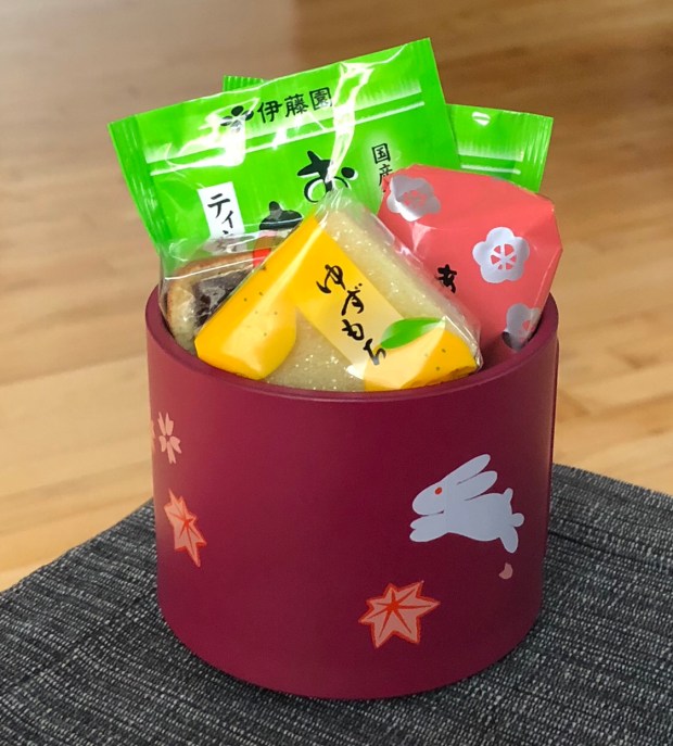 A quick gift to put together for last minute giving. I went with a Japanese theme using green tea bags and Japanese cakes but you could go with Earl Grey and shortbreads or hot chocolate and gingerbread men.