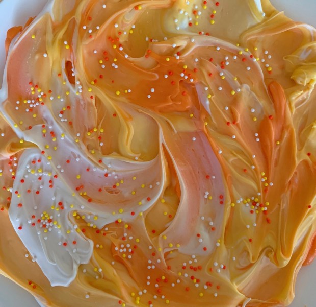 Since I had leftover candy melts from the eyeballs, I melted and added those and swirled them around for more of a candy corn look and then topped it with nonpareils.