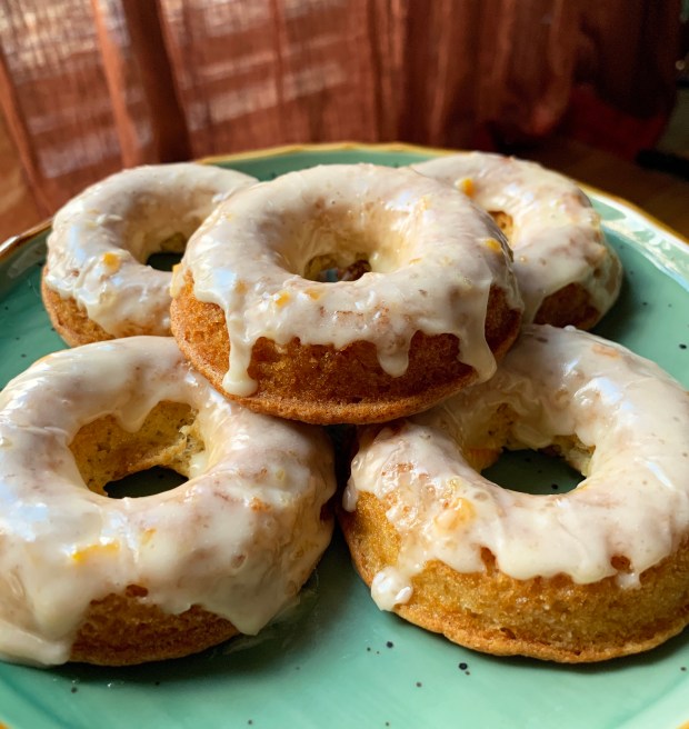 The recipe makes for a cake that’s moist and not overly sweet. I made it in a regular loaf pan, but used the leftover batter to test out my new silicone doughnut pan. A quick glaze with powdered sugar, marmalade and lime juice finished them off. They were just as moist as the cake and a lot more fun.