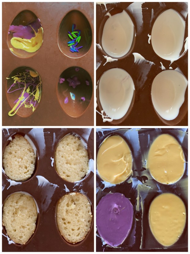 Melt the candy melts of your choice. You can also use white chocolate chips and then color them as you with. You could also use chocolate if that’s more to your liking. Coat the egg mold with the melted candy in any pattern you like. I tried placing sprinkles in the bottom, but they didn’t come out as clearly. If you want to go the sprinkles route, you might want to see if you can find jumbo ones.