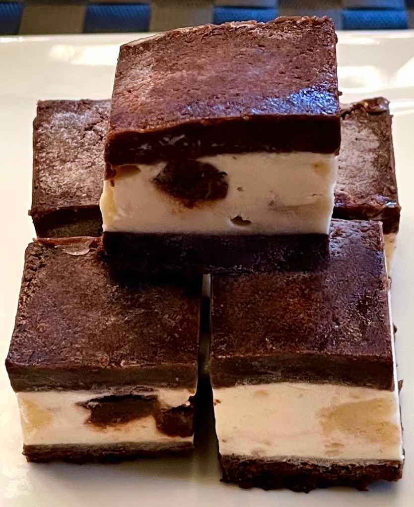 I didn’t have any icing, so I added a bit of Nutella to hold it together. I rolled it out between parchment paper and cut it into two equal pieces. After spooning on some slightly softened ice cream (Ben&Jerry’s Netflix & Chill’d) on one half, I topped it with the other, wrapped it in the parchment paper, pressed evenly and popped it back in the freezer.